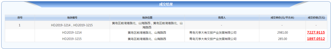 11月8日,位于西海岸前湾港路北侧、山海路西侧两宗土地成交,最终被青岛元亨大有文旅产业发展有限公司(慧华元亨实业)9124万元竞得,宅地成交楼板价2981元/㎡,总建面9.08万㎡。