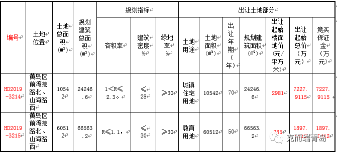 HD2019-3215号教育用地黄岛区前湾港路北、山海路西;占地6.05万㎡,容积率1.1,建面6.05万㎡,起始楼面价285元/㎡,起拍总价1897万元。